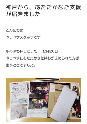 毎年東北へ足を運ばれていらっしゃる諫山さんから、防災士でアーティストの石田裕之さんをご紹介いただいた繋がりで、石巻の特定非営利活動法人やっぺす(前:石巻復興支援ネットワーク)さんが必要とされているということを知り、皆の気持ちを送らせていただく事ができました。