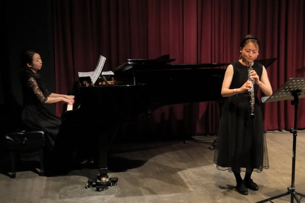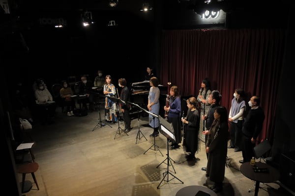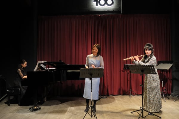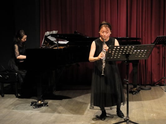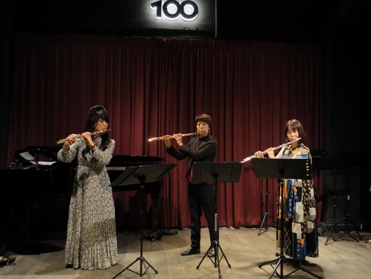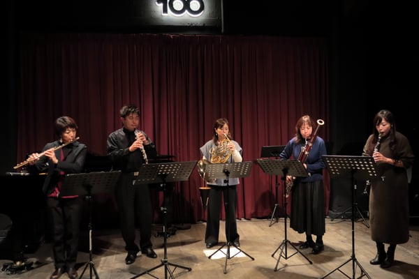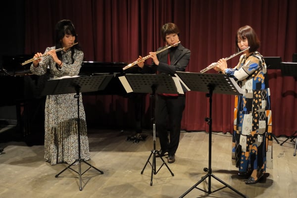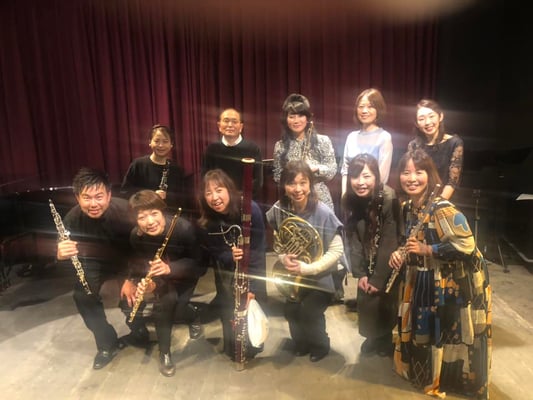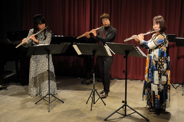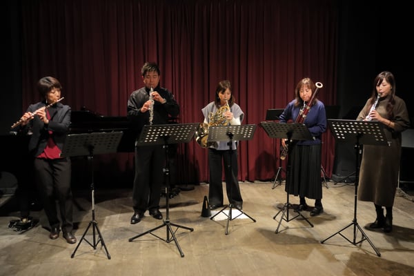 演奏は、さくら木管五重奏(フルート久保田裕美、オーボエ井口英樹、クラリネット山内静、ホルン木村文子、ファゴット野崎実果)、A1タイプのフルートトリオ(橋本恵菜、大鶴華子、久保田裕美)、元京都市交響楽団のオーボエ髙島美紀と多方面でご活躍のピアニスト崔万智子、美しきソプラノ石橋文恵(大鶴さん・崔さんとのトリオで演奏)、大久保は居酒屋の穴婆メンバーの三味線