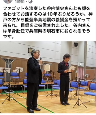 本チャリティコンサートにもご出演いただいた能登のファゴット奏者の谷内さんと、コンサート後にあれこれと相談させていただいて、石川県七尾市の市民楽団「七尾っ子オーケストラ」(メンバーに被災者の方が多くいらっしる中、又、以前に使用していたホールや練習場所が被災したり避難所になっていて使用できない状況の中、少しでも元気をだせる活動を少しずつでもしていきたいとの考えを持っている団体)のために使っていただくことになりました。