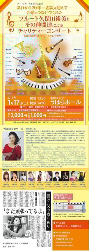 本コンサートは、宮城県南三陸の子供達を応援するコンサートです。集まった支援金は、フルート奏者久保田裕美が 今年3月12日に南三陸推進ネットワークに直接お届けいたします。