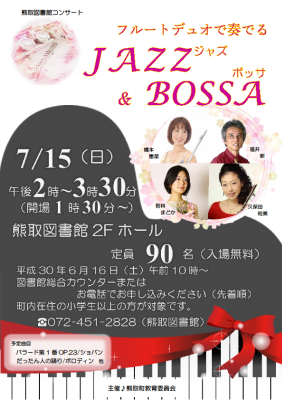 フルート2本とピアノ、パーカッションでジャズやボサノバなどの演奏です♫
