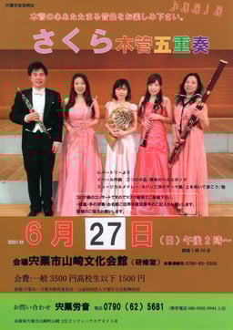 出演者:久保田裕美(フルート)井口英樹(オーボエ)山内静(クラリネット)木村文子(ホルン)野崎実果(ファゴット)